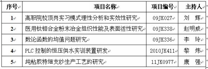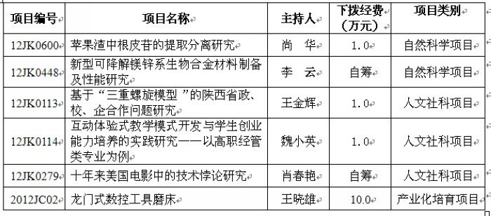 根据陕西省教育厅《关于下达2012年科学研究项目计划(二)及2012年科学研究项目计划(一)经费的通知》(陕教技〔2012〕7号),经专家评审,2012年省教育厅科学研究计划项目已经确定,全省共立项产业化培育项目26项,...